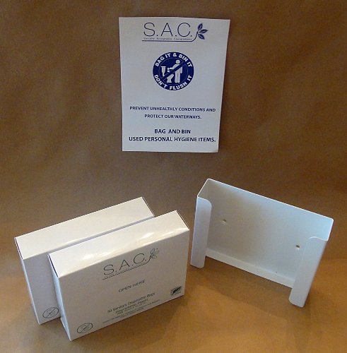 S.A.C. Home or Office version starter kit - 2 boxes Sanitary Napkin Disposal bags (SB8836) and 1 dispenser without lock, invisible design (SD2014B) in classic white powder coated metal. Dispenser Made in the USARead more Sanitary Napkin Disposal - Home or Office S.A.C.